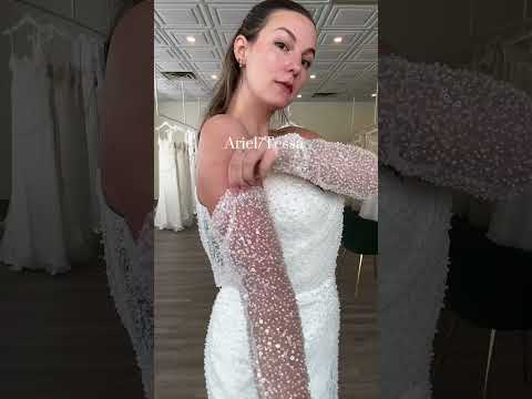 The Ariel/Tessa wedding dress gives a perfect example of how customizable our canadian made wedding gowns really are. Our model Dali, bridal size 10, is wearing a sparkly version of the dress, complete with matching gloves. While our other model Yas, bridal size 20, is wearing the exact same dress in the Italian Satin.